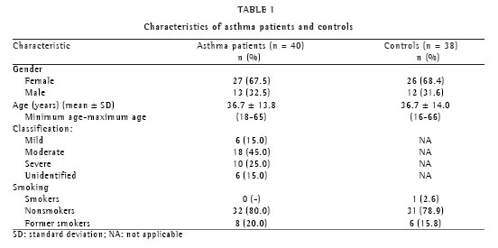 Table 1 shows the main characteristics of the participating patients. There was predominance of females (approximately 68%) and of nonsmokers (approximately 80%) in both groups. Most of the asthma patients (70%) were diagnosed with moderate to severe asthma when admitted to the outpatient clinic. Of the 78 individuals studied, only one was a smoker (in the control group) and 14 were former smokers (8 asthma patients and 6 controls).