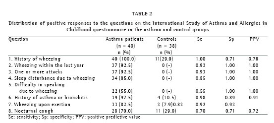 Table 2 shows the frequencies of positive responses for each of the questions, as well as the respective sensitivities, specificities and positive predictive values. The questions related to wheezing within the last 12 months, one or more wheezing attacks within the last 12 months, sleep disturbance within the last 12 months and difficulty in speaking caused by wheezing within the last 12 months showed the highest specificity (Sp = 1.00). These questions also showed the highest positive predictive values. The question presenting the most sensitivity was that related to a history of wheezing (Se = 1.00), followed by that related to a history of asthma or bronchitis (Se = 0.98).