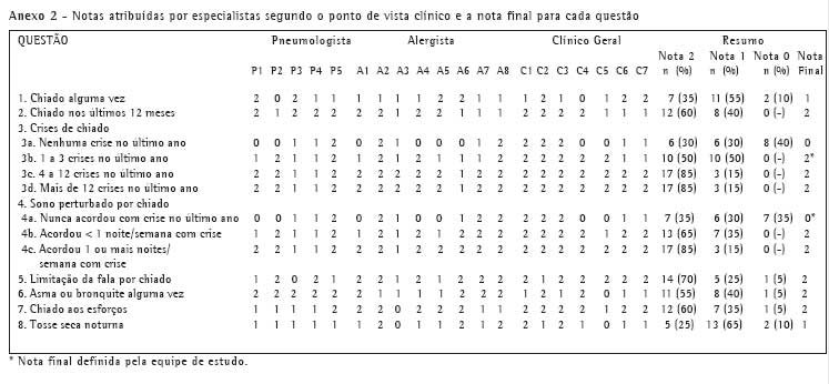 O Anexo 2 apresenta a distribuição das notas atribuídas por especialistas, a distribuição percentual e a nota final para cada questão. Houve empate na questão 3b (1 a 3 crises no último ano), em que dez especialistas consideraram esta informação importante para o diagnóstico de asma e dez a consideraram auxiliar, mas não fundamental. A equipe concluiu que esta informação é importante e, portanto, atribuiu-lhe nota 2. A questão 4a (nunca acordou com crise no último ano) foi considerada importante para o diagnóstico de asma por sete especialistas, enquanto que o mesmo número de especialistas não a considerou importante. Concluiu-se pela nota 0, a qual indica que a ausência de perturbação do sono por crises de chiado não é importante para o diagnóstico de asma.