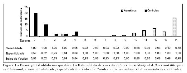 A Figura 1 apresenta a freqüência dos escores globais em indivíduos asmáticos e controles e suas respectivas sensibilidade, especificidade e índice de Youden. A análise descritiva do gráfico mostra que um escore maior do que quatro foi obtido somente por indivíduos asmáticos. Entretanto, verifica-se que os escores 3 e 4 incluem tanto indivíduos asmáticos quanto controles, possibilitando a ocorrência de uma classificação equivocada em ambos os grupos.