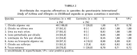 A Tabela 2 apresenta as freqüências de respostas afirmativas para cada uma das questões, assim como os respectivos valores de sensibilidade, especificidade e valores preditivos positivos. As questões sobre presença, nos últimos doze meses, dos sintomas de chiado no peito, uma ou mais crises de chiado, perturbação do sono e limitação da fala por chiado mostraram maior especificidade (E = 1,00). Estas questões também tiveram o mais alto valor preditivo positivo. A questão mais sensível foi sobre a presença de chiado alguma vez na vida (S = 1,00), seguida pela questão sobre presença de asma ou bronquite alguma vez na vida (S = 0,98).