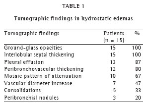 METHODSA retrospective study was conducted on the basis of a review of radiology files from five medical institutions in the state of Rio de Janeiro: Clementino Fraga Filho University Hospital; Barra D'Or Hospital; Copa D'Or Hospital; Central Army Hospital; and Mário Lioni Clinical Hospital. High-resolution computed tomography scans were acquired from fifteen patients with pulmonary edema of multi-etiological hydrostatic origin, assessed from 2000 to 2005.