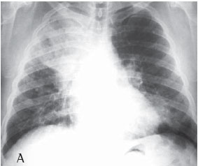 A silicose complicada é caracterizada na radiografia simples de tórax por grandes opacidades com mais de 1 cm de diâmetro, com áreas homogêneas de consolidação de distribuição não segmentar acometendo principalmente os campos superiores. As lesões tendem a se formar na periferia e migram em direção ao hilo, deixando um tecido pulmonar enfisematoso entre a consolidação e a superfície pleural. As margens das grandes opacidades são irregulares e mal definidas. Com o avançar da doença, as massas tendem a se contrair, surgindo enfisema e bolhas ao seu redor e nas bases pulmonares. Os pulmões perdem volume gradativamente. As grandes massas da silicose complicada podem escavar, em decorrência de isquemia e necrose. A escavação, todavia, é relativamente não freqüente na silicose e, quando ela ocorre, deve-se antes pensar em tuberculose. O espessamento pleural observado com freqüência na tuberculose é também comum na fibrose maciça progressiva, porém derrame pleural é extremamente raro.(17)