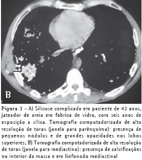Alguns autores(20) descreveram calcificações esparsas no interior das massas da FMP decorrente da silicose, e outros(21) relataram calcificação linfonodal em 26 de 49 casos de silicose estudados, com 12,2% do tipo casca de ovo, sendo que esta manifestação radiológica foi muito mais freqüente na silicose complicada do que na nodular simples.
