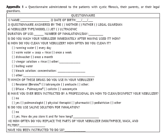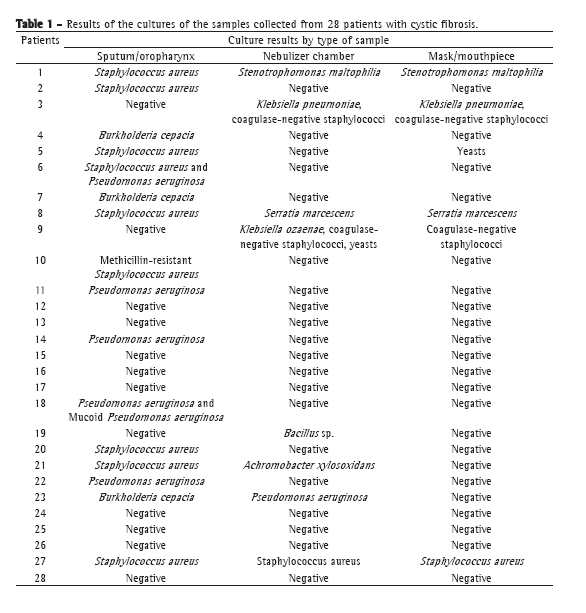 Objective: To determine whether nebulizers are a source of microbial contamination in patients with cystic fibrosis, as well as whether the technique and frequency of disinfection of these devices is appropriate. Methods: This was a cross-sectional, uncontrolled observational study. Samples were collected from 28 patients with cystic fibrosis. Samples were collected at the homes of the patients, who were not previously informed of the purpose of the visit. Three samples were collected from each patient: one from the nebulizer chamber, one from the mask/mouthpiece, and one from the patient (oropharyngeal swab/sputum). The samples were properly stored and taken for analyses. The patients, their parents, or their legal guardians completed a questionnaire regarding nebulizer cleaning and disinfecting methods. Results: We collected 84 samples from the 28 patients. Of those 28 patients, 15 (53.5%) were male. The median age of the patients was 11 years (range, 1-27 years). Of the 28 patients, 15 presented with positive oropharyngeal swab/sputum sample cultures. The most common bacterial isolates were Staphylococcus aureus (in 8 patients) and Pseudomonas aeruginosa (in 4 patients). Although the samples obtained from the nebulizers presented with various pathogens in culture, no specific species predominated. In 27 cases (96.7%), there were no associations between the samples obtained from the nebulizers and those obtained from the patients in terms of the results of the cultures. Cleaning and disinfection of nebulizers were inappropriate in 22 cases (78.6%). Conclusions: In this sample of patients, despite the inappropriate disinfection techniques, nebulizers were not found to be a source of microbial contamination.