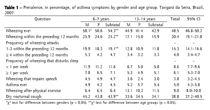 In conclusion, the prevalence of asthma among children and adolescents in Tangará da Serra is high, a finding consistent with those of other studies carried out in Brazil and in Latin America using the ISAAC questionnaire.