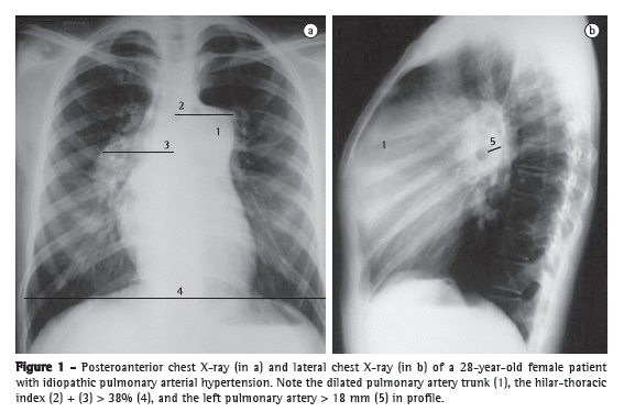 Although the presence of PH can be suggested by conventional X-ray, the specificity of this method and its degree of accuracy in estimating the severity of PH are controversial.(7) Several factors, such as the size of the patient, the distance between the X-ray tube and the film, and the distance between the pulmonary artery and the film, affect the interlobar artery measurements. Many of the parameters used are subjective, and the measurements correlate poorly with the degree of PH.(7) Nevertheless, routine chest X-ray plays a central role in the initial investigation of dyspnea, as well as in the initial evaluation of patients with suspected PH.