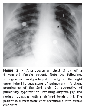 Chest X-ray can facilitate the differential diagnosis with pulmonary parenchymal disease, heart failure, COPD, and kyphoscoliosis, as well as raising the suspicion of pulmonary thromboembolic disease when there are findings of oligemia, multiple areas of consolidation suggestive of pulmonary infarction, or asymmetry among the major pulmonary arteries (Figure 2).(7)