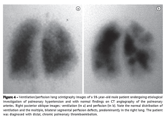 The role of scintigraphy in the assessment of patients with PH, as well as in the assessment of patients with acute pulmonary embolism,(22) is well-established. A study conducted in 1994 involved 75 patients with documented causes of PH.(23) Of the 25 patients with chronic thromboembolic PH, 24 (96%) had high-probability scans and 1 (4%) had an intermediate-probability scan. Conversely, of the 35 patients with primary PH, 33 (94%) had low-probability scans, 1 (3%) had an intermediate-probability scan, and 1 (3%) had a high-probability scan. Of the 15 patients with non-thromboembolic secondary PH, the result was less accurate: 10 (67%) had low-probability scans, 3 (20%) had intermediate-probability scans, and 2 (13%) had high-probability scans. In view of the poorer yield in this third group of patients, the great importance of scintigraphy, in the context of PH, lies in the fact that it can rule out thromboembolic disease: a low-probability scan definitely excludes this disease. Another study showed that, in comparison with multidetector CT (MDCT), scintigraphy has far greater sensitivity for detecting chronic pulmonary embolism (96% vs. 51%).(24)