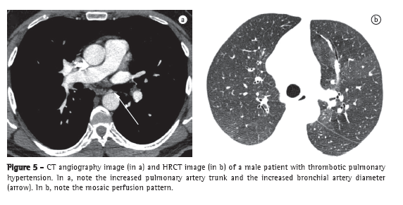In the assessment of peripheral pulmonary circulation, CT angiography can uniformly access vessels of up to 2-3 mm with nearly constant opacification, high resolution, and no image overlap. This characteristic greatly contributes to the anatomical assessment of the pulmonary circulation. However, when it comes to visualization and quantification of the pulmonary microcirculatory flow, the method once again has functional limitations. The limited microcirculatory blood flow during vasoconstriction and vascular remodeling, characteristic of PH, can be visualized on HRCT scans (parenchymal window) as a mosaic perfusion pattern, which is present in patients with PH of various causes (Figure 5).(32) In some cases, there are also areas of increased lung parenchymal attenuation that are attributable to microcirculatory flow redistribution when the number and diameter of the vessels are increased in these regions. Both phenomena, mosaic perfusion and flow redistribution, are findings that are particularly more prevalent in chronic PTE. Dual-source CT, a new imaging technique in which images are obtained with two X-ray tubes, each with a different voltage, can access regional lung perfusion with greater accuracy, providing functional information.(33) This technology makes it possible to perform a CT angiography study and a perfusion study in a single test.