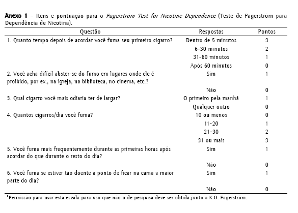 Vários instrumentos foram desenvolvidos a fim de avaliar a dependência física à nicotina. Dentre tais instrumentos, os mais amplamente usados são o Fagerström Tolerance Questionnaire (FTQ, Questionário Fagerström de Tolerância), criado em 1978,(4) e sua versão melhorada, o Fagerström Teste for Nicotine Dependence (FTND, Teste de Fagerström para Dependência de Nicotina, Anexo 1), ambos elaborados por Fagerström et al.(5,6) O FTND foi desenvolvido principalmente porque o FTQ tinha significativas desvantagens psicométricas, tais como consistência interna inaceitável, pouca validade de critério e estrutura multifatorial.(7)