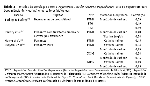 Em quatro estudos diferentes,(12,21,27,32) as correlações entre o escore do FTND e os marcadores biológicos foram investigadas (Tabela 4). Em um estudo com fumantes com dependência ao álcool e à nicotina, foi relatado um coeficiente satisfatório de correlação (0,59) para a relação entre o escore do FTND e o nível de monóxido de carbono.(21) Em contraste, um estudo recente envolvendo fumantes leves demonstrou que a correlação entre o escore do FTND e o nível de monóxido de carbono foi muito fraco (0,19), bem como o foi a correlação (0,24) entre o escore do FTND e a cotinina salivar.(32) Em uma investigação da população geral,(12) foi observada melhor correlação entre o escore do FTND e a cotinina salivar (0,45). Os resultados apresentados nesses quatro estudos indicam que, de modo geral, a correlação entre o FTND e os marcadores biológicos avaliados varia de fraca a moderada.