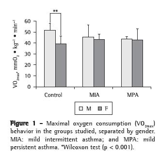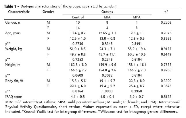 This was a descriptive, cross-sectional study involving 48 male and female adolescent students (12-14 years of age), residing in the city of Santa Maria, Brazil, who were divided into three groups: control (no asthma; n = 24); mild intermittent asthma (MIA; clinical diagnosis; n = 12); and mild persistent asthma (MPA; clinical diagnosis; n = 12). All of the participants reported having had no asthma attacks for a while.