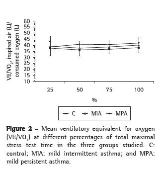 The VE/VO2 ratio describes the respiratory efficiency, as well as revealing the amount of air to be ventilated per liter of consumed oxygen.(19) The comparison among the groups allowed us to determine whether or not the similar oxygen consumption, shown in Figure 1, occurred because of ventilatory compensation, such as an increase in ventilation, indicating poorer respiratory efficiency in the study subjects than in the controls.