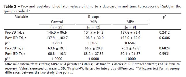 In order to determine the existence of differentiated responses to hypoxia, the groups were induced to acute hypoxia before and after bronchodilator use, and Td and Tr were analyzed (Table 3). The data showed that there were no significant intergroup differences in Td or Tr before bronchodilator use. Therefore, the subjects with asthma, when compared with each other or with the subjects in the control group, did not show a better response to hypoxia. The Td and Tr results showed no significant intergroup differences even when tested after bronchodilator use. The variables Td and Tr were assessed for correlations with the variables related to blood oxygen tension and the ventilatory variables, and there was no evidence of an association for any of them.