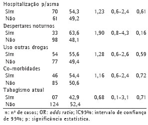 estudados (idade, raça, estado civil, sexo, escolaridade, tabagismo atual, concomitância com outras atopias, presença de co-morbidades, uso de outras medicações, internações e comparecimento a emergências por asma, uso de medicações de resgate para asma e despertares noturnos).