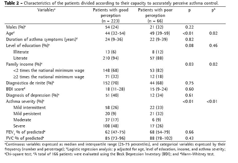 Objective: To determine the proportion of asthma patients with poor perception of asthma control and to evaluate the characteristics of this subgroup. Methods: A cross-sectional study in which consecutive outpatients (over the age of 12) with mild, moderate, or severe asthma were selected. The patients underwent clinical examination, and pulmonary function tests, as well as being assessed for depression and perception of asthma control. The degree of concordance between patients and physicians regarding the perception of asthma control was determined. Patients with good perception of asthma control were compared, in terms of characteristics, with those presenting poor perception. Results: The degree of concordance between patients and physicians regarding the perception of asthma control was low (kappa index = 0.5). Of the 289 patients included, 66 (23%) presented poor perception of asthma control. The preliminary univariate analysis revealed that the patients with poor perception of asthma control were older, had a lower income, and presented a lower degree of asthma severity. Those factors did not change in the multivariate analysis. There were no differences between the groups in terms of gender, frequency of having literate patients, duration of asthma symptoms, having been diagnosed with rhinitis, frequency of depression, pulmonary function, or treatment compliance. Conclusions: The incidence of poor perception of asthma control in asthma patients is high, especially in elderly patients with lower income and a lower degree of asthma severity.