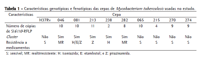 As cepas clínicas foram isoladas de pacientes com tuberculose pulmonar. A cepa de M. tuberculosis H37Rv foi obtida junto ao American Type Culture Collection (Manassas, VA, EUA). As características das diversas cepas são descritas na Tabela 1. O teste de sensibilidade foi realizado por meio do método das proporções em meio de Löwenstein-Jensen (LJ),(4) e o padrão da sequência de inserção 6110 (SI6110) foi obtido por meio da análise de RFLP.(5,6) Recrutamos 11 voluntários saudáveis, os quais foram submetidos ao teste tuberculínico (TT). Dos 11 voluntários, 6 apresentaram resultado positivo (TT+, induração ≥ 5 mm) e 5 apresentaram resultado negativo (TT−). Nenhum dos voluntários tinha histórico de tuberculose. Todos os voluntários assinaram um termo de consentimento livre e esclarecido.
