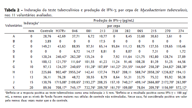 Amostras de sangue foram coletadas, e as PBMCs foram preparadas conforme descrito por Tavares et al.(7) Obteve-se a estimulação in vitro de 106 células/poço por meio de incubação, durante três dias, com uma suspensão contendo 105 bacilos/poço e, como controle positivo, 5 µg/mL de PHA (Sigma, St. Louis, MO, EUA). O sobrenadante das culturas celulares livres de bactérias foi coletado e armazenado imediatamente a −70°C para a quantificação de IFN-γ por meio de ELISA (R&D Systems, Minneapolis, MN, EUA). Níveis de IFN-γ > 100 pg/mL foram considerados positivos. A suspensão de bacilos foi preparada através do cultivo das cepas em meio de LJ a 37°C durante três semanas. O crescimento fresco foi removido, colocado em um tubo contendo pérolas de vidro de 3 mm e agitado em vórtice durante 1 min. Após a adição de PBS-Tween 80 a 5%, o crescimento micobacteriano foi disperso (através de aspirações múltiplas com uma agulha 25G), agitado em vórtice e meticulosamente lavado duas vezes com PBS por meio de centrifugação. Aguardamos 30 min até que as partículas maiores remanescentes decantassem, e, após esse período, a contagem de células do sobrenadante foi ajustada para 1 na Escala de McFarland e, em seguida, para o número desejado. Verificamos a ausência de grumos celulares na suspensão por meio de baciloscopia para BAAR. Os resultados foram expressos em média ± ep. Os dados foram analisados por meio do teste t de Student não paramétrico. O ponto de corte para IFN-γ foi 100 pg/mL, a menos que os níveis de fundo fossem maiores nas células de controle não estimuladas. Nesse caso, foi considerado positivo um valor pelo menos duas vezes maior que o do controle.