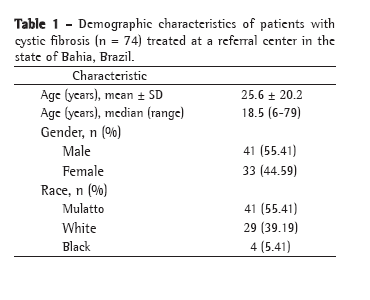 This was a cross-sectional study, with prospective data collection, involving a sample of 74 patients (≥ 6 years of age) diagnosed with cystic fibrosis, aged 6 years or older, treated between December 9, 2003 and March 7, 2005 at the Cystic Fibrosis Referral Center of Bahia - Octávio Mangabeira Specialized Hospital. The project was approved by the Ethics in Research Committee of the Foundation for the Development of Science/School of Medicine and Public Health of Bahia, and was initiated after written informed consent had been obtained from the patients older than 18 years of age and from the legal guardians of those younger than 18.