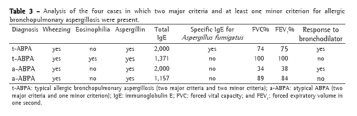 Table 3 shows the analysis of the 4 cases in which the criteria for a diagnosis of ABPA were met.