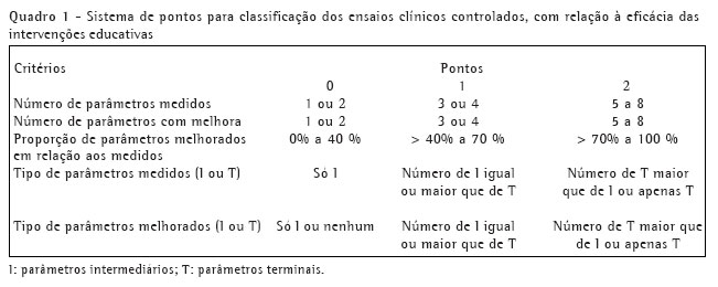 Para se avaliar a credibilidade e eficácia de cada intervenção educativa, os trabalhos controlados receberam pontos, de acordo com o Quadro 1.