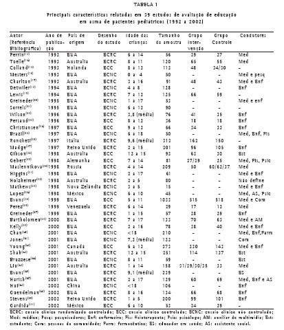 DISCUSSÃOChamou a atenção o pequeno número de trabalhos sobre educação em asma de pacientes pediátricos, publicados no período estipulado e que atenderam aos critérios desta revisão. Foi notória também a grande diversidade de modelos de estudo, o que provavelmente reflete a carência de pensamentos consensuais nessa área. Diante da grande heterogeneidade dos trabalhos, optou-se por desenvolver uma revisão analítica, ou seja, com análise secundária dos dados, por permitir abranger e avaliar trabalhos de desenhos e métodos educativos diversos.