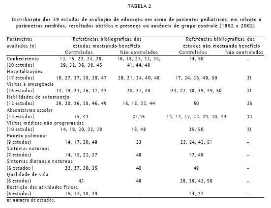 A Tabela 2 permite comparar, em cada parâmetro avaliado, o número de estudos com e sem benefício. Assim, observa-se que o número de estudos demonstrando benefício foi maior que o de estudos sem benefício, quando se avaliaram a freqüência de visitas médicas não programadas, sintomas noturnos, sintomas diurnos ou noturnos, restrição às atividades físicas, hospitalizações, visitas à emergência, função pulmonar, grau de conhecimento sobre a doença e habilidades de automanejo. Ao contrário, o número de estudos mostrando benefícios sobre o absenteísmo escolar e o índice de qualidade de vida foi menor que o de estudos que não mostraram benefícios. Considerando-se apenas os estudos controlados, houve número igual de estudos mostrando benefício ou não o mostrando, em relação à freqüência de visitas à emergência e função pulmonar. Quanto aos demais parâmetros, observou-se a mesma relação entre estudos com e sem benefício relatada para o total de 39 estudos. Não se encontraram diferenças com relação ao número de conteúdos, de técnicas educacionais e tipos de profissionais condutores das intervenções, entre os estudos que mostraram benefícios e os que não os mostraram.