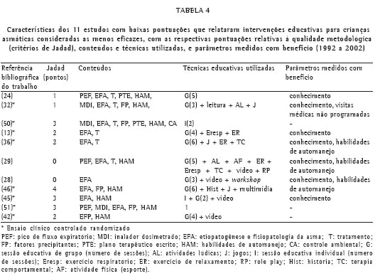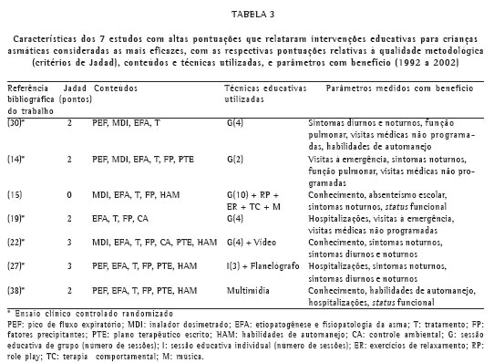 Está bem estabelecida a eficácia de alguns programas educativos em adultos,(55) porém na revisão sistemática publicada pelo Cochrane Airways Group, os principais resultados das intervenções educativas em crianças asmáticas foram pouco expressivos: modesta redução em dias de absenteísmo escolar, no número de noites com sintomas, na freqüência de visitas à emergência e no número de dias de restrição das atividades.(9) Na presente revisão, os resultados foram variáveis, conforme o parâmetro medido e, de certa forma, controversos ao se compararem os diversos estudos. Contudo, a alta freqüência de benefícios em pelo menos um dos parâmetros medidos indica o potencial terapêutico das intervenções educativas em asma pediátrica e a necessidade de se continuar a pesquisar nessa área. A avaliação da qualidade metodológica dos estudos, através dos critérios de Jadad, mostrou que entre os EAP houve maior concentração de estudos de qualidade satisfatória que entre os EBP, apesar de que 7 estudos deste último grupo foram também considerados de qualidade satisfatória ou boa. Um estudo(15) dentre os EAP e 3 estudos(24, 28-29) dentre os EBP não foram randomizados. Não foi possível avaliar a influência dos desenhos metodológicos sobre as diferenças de eficácia das intervenções educativas nos EAP e EBP.