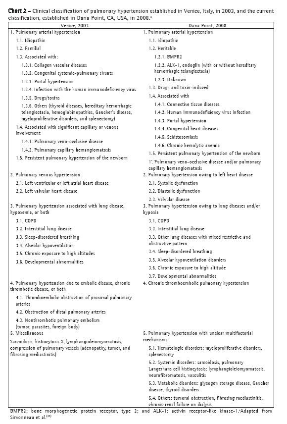 ClassificationThere have been various changes in the clinical classification of PH. Although the basic structure of the 2003 Venice classification-five principal groups and their respective subgroups-was maintained, pathologies have been moved from one group or subgroup to another. In addition, some new groups or subgroups have been created, whereas others have been eliminated. These changes are described below. The former and current classifications are compared in Chart 2.(23)