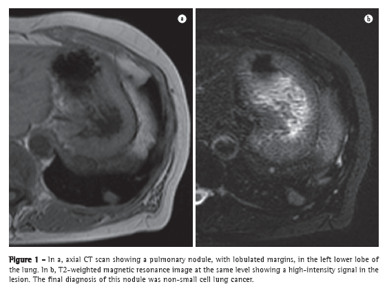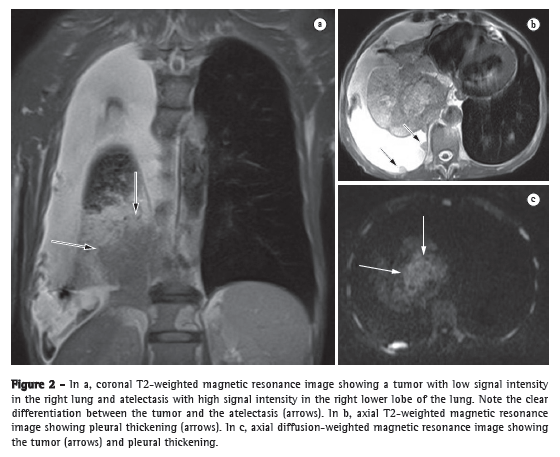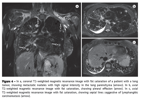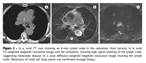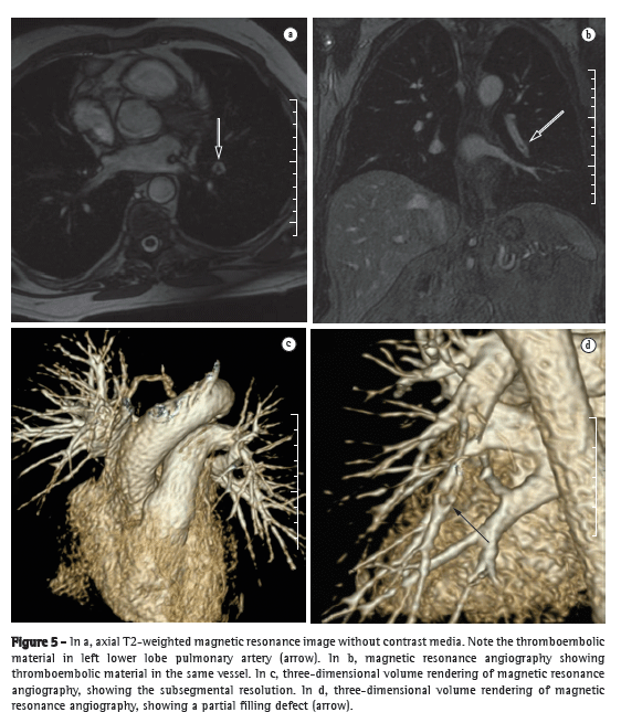 Magnetic resonance imagingAdvances in the techniques for acquiring and processing magnetic resonance imaging of the heart have allowed three-dimensional evaluation of the RV and detailed tomographic visualization of its morphology. Cardiac magnetic resonance imaging (CMRI) creates a clear distinction between the myocardium and intracavitary blood, presenting well-defined myocardial and endocardial borders.(8) Because the RV presents the aforementioned particularities and CMRI allows a more detailed visualization of the RV, CMRI is currently considered the gold standard for a noninvasive evaluation of the RV.(9,10) Studies in which CMRI was used to evaluate patients with PH showed that, when compared with control group patients, PH patients presented with a significant increase in end-systolic and end-diastolic volumes, as well as in right ventricular muscle mass, together with a significant reduction in right ventricular ejection fraction. Other studies have shown ventricular septal bowing, together with a reduction in the LV volume in early diastole, revealing impaired left ventricular function associated with right ventricular dysfunction.(11) One group of authors demonstrated that the position of the septum, as determined by calculating its shift toward the LV, was accurate in predicting right ventricular systolic pressure.(12) Even without the use of contrast enhancement, CMRI allows excellent visualization of the PA, and it is possible to assess PA compliance and flow by means of the phase-contrast technique. In patients with PH, PA compliance values are significantly lower.(13) One study showed that measurements of pulsatility (which is related to compliance) can also correlate with the response to the NO test.(14) The measurement of PA velocity and the time it takes to reach the maximum velocity (acceleration time) are reduced in patients with PH, and these measurements are related to systolic volume as measured by RHC.(15) In addition, CMRI plays a role in the follow-up of patients with PH. Two studies used CMRI before treatment initiation and 6-12 months after treatment initiation. In one of the studies, the patients received epoprostenol, and in the other, they received bosentan.(16,17) In both studies, improvement in the six-minute walk test (6MWT) was significantly related to improvement in right ventricular function parameters, as determined by CMRI. In another study, CMRI was used before and after pulmonary thromboendarterectomy.(18) The study showed a significant reduction in myocardial mass, right ventricular end-systolic volume, and right ventricular end-diastolic volume, as well as increased left ventricular volumes, reflecting the reversion of ventricular remodeling and septal deviation, hemodynamic improvement having been achieved with the surgical procedure (Figure 2c).