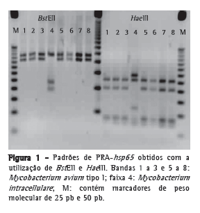 Nos últimos anos, o número de micobactérias não tuberculosas (MNT) isoladas de espécimes clínicos vem aumentando, em parte devido a infecções oportunistas que acompanham a imunossupressão. Tradicionalmente, o diagnóstico definitivo de infecções por micobactérias depende do isolamento e identificação dos agentes causadores e requer uma série de testes fisiológicos e bioquímicos específicos. Em razão de as espécies de micobactérias apresentarem diferentes sensibilidades a drogas, a identificação precisa é crucial para a adoção da terapia medicamentosa adequada, podendo, em última instância, afetar o desfecho dos pacientes.(1) Plikaytis et al.(2) e Telenti et al.,(3) utilizando regiões distintas do gene, descreveram a identificação bem sucedida de micobactérias por meio da análise de restrição por digestão de fragmentos amplificados do gene hsp65 - hsp65 PCR-restriction enzyme analysis (PRA, análise por enzimas de restrição por PCR do gene hsp65). A maioria dos padrões de DNA gerados pela análise por enzimas de restrição de produtos de PCR específicos para Mycobacterium são específicos para cada espécie, e a PRA de parte do gene hsp65 é apenas um método que tem sido utilizado como meio de identificação de espécies de micobactérias.(4) O objetivo do presente estudo foi identificar, por meio do método de PRA, isolados coletados entre 2001 e 2006 de sítios estéreis de pacientes clínicos internados em um hospital universitário na cidade do Rio de Janeiro (RJ).