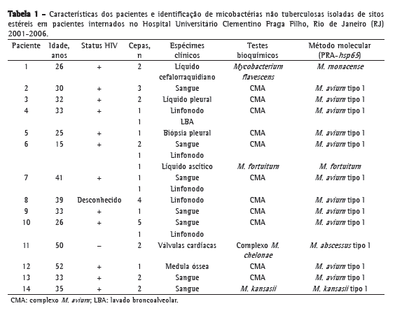Entre 2001 e 2006, foram identificados 34 isolados de micobactérias atípicos de vários espécimes biológicos (pelo menos um de sítio estéril em cada paciente). Essas amostras foram coletadas de 14 pacientes internados no Hospital Universitário Clementino Fraga Filho, Rio de Janeiro (RJ). Os prontuários dos 14 pacientes foram revisados retrospectivamente. Dos 14 pacientes, 12 eram HIV positivos.