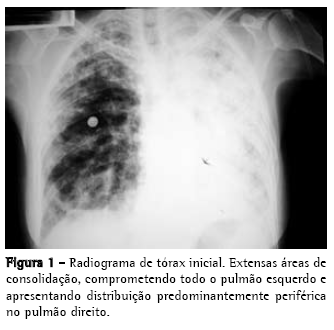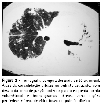 Ao exame físico, apresentou regular estado geral e febril, sem alterações na ausculta cardíaca. Apresentava-se dispnéica e taquipnéica (freqüência respiratória entre 28 e 40 mrm). À inspeção e palpação do tórax, observou-se expansibilidade reduzida e simétrica; a ausculta pulmonar revelou crepitações grosseiras e roncos bilateralmente, predominantes no hemitórax esquerdo.