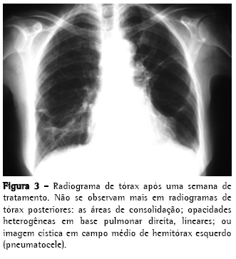 A evolução após a introdução da corticoterapia foi brilhante: houve resolução da febre e da eosinofilia em três dias; após uma semana, melhora da hipoxemia (SpO2 = 94% em ar ambiente) e das alterações radiológicas, restando apenas imagem cística no pulmão esquerdo que não foi mais detectada em radiografias posteriores, sendo assim interpretada como pneumatocele (Figura 3).