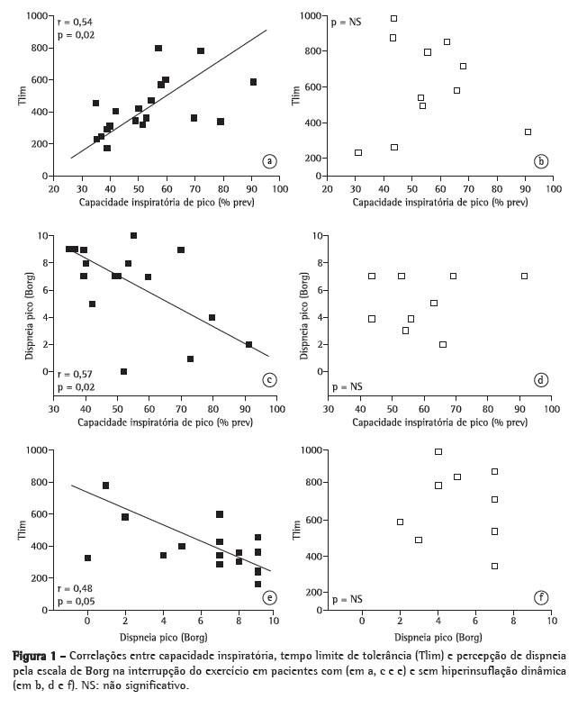 A principal limitação do estudo foi a falta de mensuração dos volumes pulmonares estáticos em repouso. Logo, as variações dos volumes foram estimadas somente a partir da CI e não do verdadeiro VPEF (isto é, CPT/CI). Embora tal limitação não tenha permitido a avaliação adequada de possíveis diferenças no grau basal de posicionamento dos volumes pulmonares operantes, medidas isoladas de CI são comumente utilizadas na prática clínica e têm elevada validade externa. Entretanto, nós reconhecemos que isso introduz um importante elemento de incerteza em relação ao intercepto no eixo y dos volumes operantes nas condições de repouso, o que recomenda cautela na interpretação dos valores de CI em repouso como indicadores de hiperinsuflação. Nossos dados também não devem ser extrapolados para pacientes hipoxêmicos, nos quais o comando hipóxico pode modular a cinética de desenvolvimento da HD. Reconhece-se, ainda, que o estudo pode não ter tido potência estatística para demonstrar as diferenças entre os subgrupos, o que parece indicar que futuras investigações abordando tais aspectos devam envolver um número substancialmente maior de pacientes. Finalmente, o teste de caminhada em esteira rolante, sob velocidade constante, não mimetiza fielmente a deambulação na vida diária; entretanto, deve-se enfatizar que, na média, a velocidade desenvolvida (aproximadamente 5 km/h) é o compromisso possível entre um teste que não seja de intensidade muito baixa, o qual tornaria difícil a interpretação de Tlim, mas que ainda mantenha algum grau de validade externa.