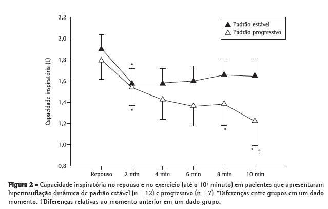 As seguintes variáveis foram medidas (respiração a respiração) e expressas como média de tempo de 15 s em valores absolutos e em percentagem do previsto(22): captação pulmonar de oxigênio (O2), em mL/min, em condições standard temperature, pressure dry (STPD); liberação pulmonar de dióxido de carbono, em mL/min, em STPD; ventilação minuto em condições body temperature, pressure saturated; volume corrente; e FR. O limiar de troca gasosa foi avaliado pelo método V-slope.(23) A FC foi determinada utilizando-se o intervalo RR de um eletrocardiograma de 12 derivações, e a SpO2 foi estimada por oximetria de pulso com um aparelho de modelo Onyx 9500T (Nonin, Plymouth, MN, EUA). As modificações dinâmicas nos volumes pulmonares operantes foram avaliadas com medidas seriadas da CI, assumindo-se que a CPT permanecia constante durante o exercício.(5) A validade, a reprodutibilidade e a sensibilidade a intervenções desse procedimento já foram amplamente demonstradas em pacientes com DPOC.(6-10) Foram realizadas duas manobras em repouso, ao final do período inicial, e a cada 2 min após o início da velocidade constante, objetivando-se obter valores reprodutíveis (diferença menor que 10% do maior valor, em cada estágio). A HD foi definida como qualquer queda da CI em relação aos valores iniciais de repouso.(24)