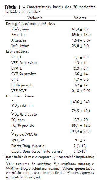 ResultadosConforme demonstrado na Tabela 1, os pacientes, em média, apresentavam distúrbio obstrutivo de grau moderado a acentuado com redução da CVF. Reduções da CI que estão habitualmente relacionadas com LFE no repouso (< 80% do previsto)(25) foram observadas em 24 dos 30 pacientes (80%). Como esperado, todos os pacientes apresentaram limitação ventilatória ao exercício e dispneia como principal sintoma limitante. O limiar de troca gasosa foi identificado em 10 pacientes, correspondendo a 51,3 ± 10,1% do O2 máximo previsto, valores esses dentro ou ligeiramente abaixo do esperado para idade e gênero.