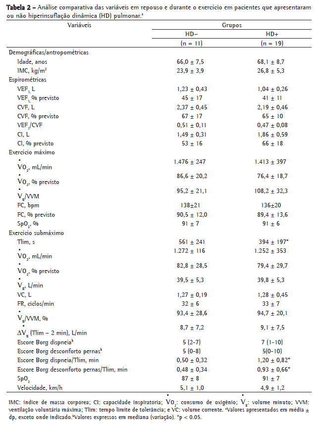Em conclusão, os resultados do presente estudo indicam que a HD não é um fenômeno universal durante a caminhada em esteira rolante em pacientes com DPOC, mesmo que esses apresentem obstrução ao fluxo aéreo de graus moderado a acentuado. Nos pacientes que apresentam HD, um padrão de redução progressiva dos volumes pulmonares operantes tem maior repercussão na tolerância ao exercício do que um padrão estável de HD. Estudos adicionais são necessários para a mensuração do impacto de tal heterogeneidade na resposta a intervenções farmacológicas e não farmacológicas nessa população de pacientes.