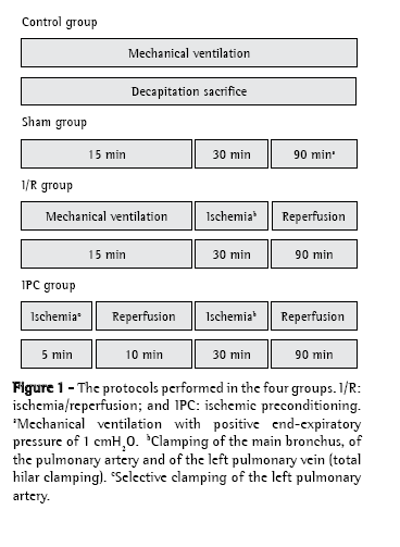 The animals were anesthetized with ketamine (100 mg/kg) and xylazine (15 mg/kg) via intraperitoneal injections, together with atropine (0.20 mg) via intramuscular injection at the time of induction, the anesthesia being maintained through administration of one-third doses of the drugs administered at 30-min intervals. Prior to being placed on MV, the animals received systemic heparin (1 mg/kg, parenteral) and were submitted to cervical tracheostomy with a plastic cannula (Abbocath® no. 14; Abbott Laboratories, Abbott Park, IL, USA). We employed a volumetric ventilator (Harvard Rodent Ventilator, model 683; Harvard Apparatus Co., Millis, MA, USA). The ventilator was set to a tidal volume of 10 mL/kg of body weight, a respiratory rate of 70-80 breaths/min, a fraction of inspired oxygen of 0.2 (on room air) and a positive end-expiratory pressure of 1 cmH2O only at the time of pulmonary reperfusion (the final 90 min of the procedure; Figure 1). At each total hilar clamping or selective arterial clamping, lung expansion was achieved through occlusion of the expiratory valve for three inspiratory cycles, in order to avoid atelectasis. Mean systemic arterial pressure was measured through cannulation of the right carotid artery (Sirecust 730; Siemens, Solna, Sweden), the same cannula being used in the collection of blood samples for the arterial blood gas analysis (ABL 5; Radiometer, Copenhagen, Denmark). Mean systemic arterial pressure and arterial blood gases were measured at various time points: before the thoracotomy (basal); before the 30-min period of ischemia (total hilar clamping) in the I/R and IPC groups; at min 15 of MV in the sham group; and at min 30 and 90 of reperfusion (before sacrifice).