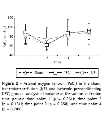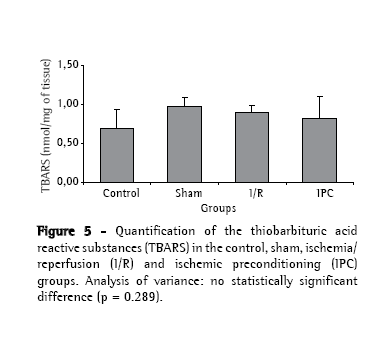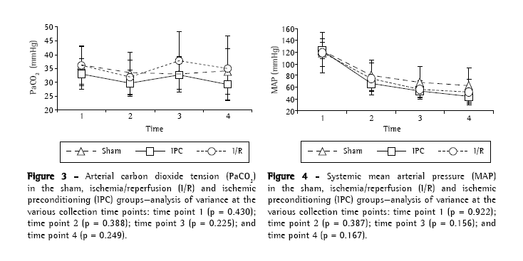 There were no statistically significant differences among the experimental groups (sham, I/R and IPC) regarding body weight (p = 0.822) or surgical time (p = 0.560), as well as, at any of the four time points analyzed, blood gas analysis findings, arterial oxygen tension (Figure 2) and arterial carbon dioxide tension (Figure 3). During the period of observation, there were gradual decreases in mean arterial pressure in all groups, although the differences among the experimental groups were not statistically significant at any of the four time points evaluated (Figure 4). In addition, there were no statistically significant differences among any of the groups in terms of the quantity of lipid peroxidation products, as assessed through determination of the levels of TBARS (p = 0.289; Figure 5).