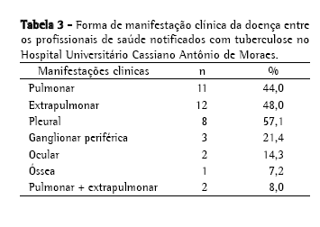 Dos 25 profissionais de saúde notificados com TB, 24 (96%) deram entrada como casos novos e um (4%) deu entrada como recidiva. Quanto à manifestação da doença, a forma clínica predominante foi a extrapulmonar, com 12 casos (48%), seguida da forma pulmonar, com 11 casos (44%), e 2 indivíduos do estudo (8%) apresentaram ambas as manifestações. Dentre todas as formas ditas extrapulmonares, incluindo os dois casos com manifestação clínica associada à pulmonar, tivemos 8 casos (57,1%) de acometimento pleural, 3 casos de forma ganglionar periférica (21,4%), 2 de forma ocular (14,3%) e um de acometimento ósseo (7,2%), como demonstrado na Tabela 3.