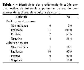 Em relação ao adoecimento por TB, só foi encontrado um trabalho dessa natureza na literatura do Brasil, realizado no período de 1975 a 1977, no Instituto de Assistência Médica do Servidor Estadual, em São Paulo, no qual os pesquisadores concluíram que os funcionários foram atingidos pela TB com freqüência de quatro vezes maior do que a população geral.(3) Mais ainda, na atualidade, a TB entre os profissionais de saúde continua sendo uma temática pouco discutida.