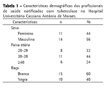 No período do estudo, foram notificados 25 casos de profissionais de saúde com TB. Em relação ao gênero da população de estudo, observamos que 14 profissionais (56%) eram do sexo masculino e 11 do feminino (44%). Quanto à idade, a faixa etária com maior proporção dos casos foi a de 30 a 39 anos. Na avaliação da variável raça, 15 casos eram da raça branca (60%) e 10 da raça negra (40%). Os dados demográficos dos profissionais de saúde incluídos no estudo estão demonstrados na Tabela 1.