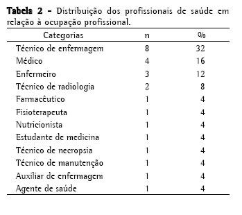 Na distribuição dos casos quanto à ocupação profissional, conforme apresentado na Tabela 2, constatamos 8 técnicos de enfermagem (32%), 4 médicos (16%), 3 enfermeiros (12%), 2 técnicos em radiologia (8%) e 8 casos de outras categorias (32%). Cerca de 48% dos casos eram da equipe de enfermagem (enfermeiro, técnico de enfermagem e auxiliar de enfermagem), e 20% da equipe de medicina (médico e estudante de medicina).