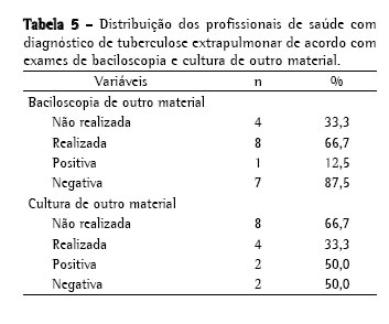Entre os 12 casos de TB extrapulmonar, a baciloscopia de outro material foi realizada em 8 casos (66,7%). Desses, 7 casos (87,5%) tiveram resultado negativo e apenas um caso (12,5%) foi positivo. Quando foram analisados os resultados de cultura de outro material, que não o escarro, certificou-se que somente 4 casos (33,3%) realizaram este exame, sendo 2 casos positivos e 2 negativos (50% cada), conforme apresentado na Tabela 5.