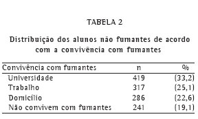 A maioria dos alunos que se declararam não fumantes afirmou conviver com fumantes, o que representou quase 80,9% da amostra (1.022), sendo predominante a convivência com fumantes na universidade, com 33,2% das respostas dadas (419) (Tabela 2).