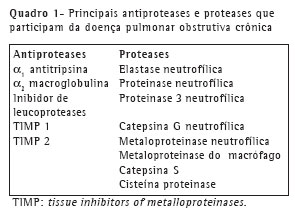 PROTEASES E ANTIPROTEASESInibidores de proteinasesA a1-antitripsina é uma glicoproteína de 52kDa sintetizada primariamente pelo fígado; consiste em uma cadeia de polipeptídeo de 394 aminoácidos, e possui atividade de inibição proteolítica da elastase neutrofílica e de outras proteinases. Em 1963, alguns autores(27) propuseram uma associação entre a deficiência sérica de a1-antitripsina e enfisema, originando uma teoria de desbalanço entre proteinase e antiproteinase para a gênese da DPOC. A sua deficiência genética traduz-se em enfisema pulmonar em jovens não fumantes (Quadro 1).