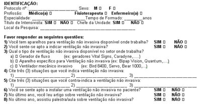 Uma equipe de cinco entrevistadores experientes no uso da VNI foi constituída. Nos hospitais visitados, o entrevistador entregava um questionário e acompanhava o preenchimento, evitando interferências nas respostas, mas à disposição para esclarecer dúvidas. O questionário foi criado para este estudo e consistia de duas partes (identificação do profissional; disponibilidade de equipamentos e grau de conhecimento, atualização e familiaridade com a VNI), com oito questões ao todo (Anexo 1)