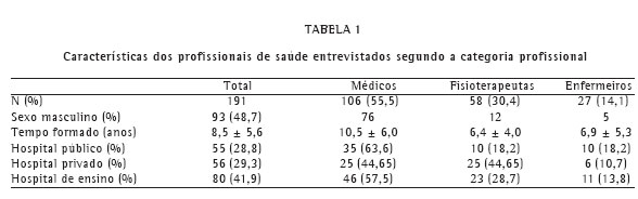 Foram visitados 15 hospitais, sendo 5 públicos, 5 privados e 5 de ensino. Nesta última categoria 3 tinham vínculo com faculdade de Medicina e 2 tinham amplos programas de residência e pós-graduação. Foram entrevistados 191 profissionais da saúde que trabalhavam nestes hospitais. As principais características dos entrevistados estão na Tabela 1. Dos médicos entrevistados 41 eram intensivistas (38,7%), 23 cardiologistas (21,7%), 14 pneumologistas (13,2%), 8 clínicos gerais (7,5%), 5 nefrologistas (4,7%) e 15 de outras especialidades (14,2%). Apenas 45 médicos responderam que tinham título de especialista em medicina intensiva (42,5%), sendo 13 em hospitais públicos (37,1%), 12 em hospitais privados (48%) e 20 em hospitais de ensino (43,5%) (p = 0,47).